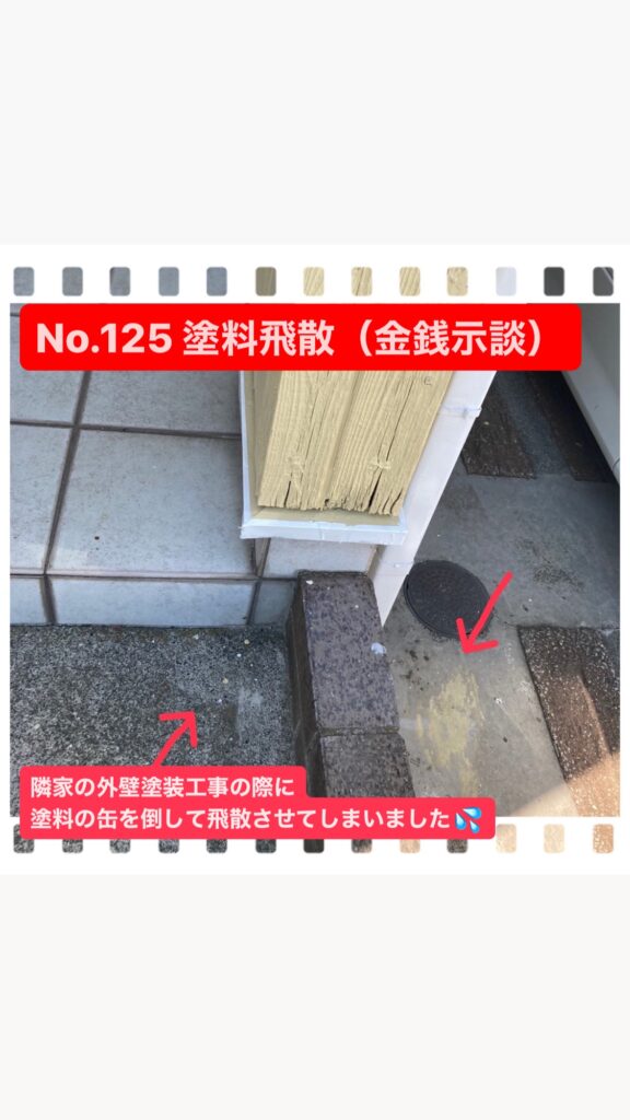 外壁塗装工事中に塗料の缶を倒して隣家に飛散させてしまった事故です💦