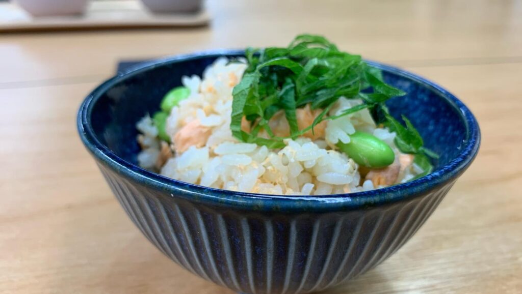 シャケと枝豆の炊き込みご飯︎シャケと調味料を入れて炊く、