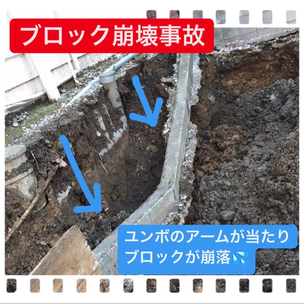 隣家との区切りのブロックにアームを接触させて崩落させてしまった事故です💦