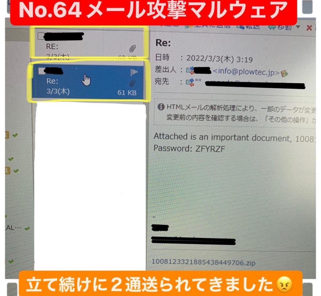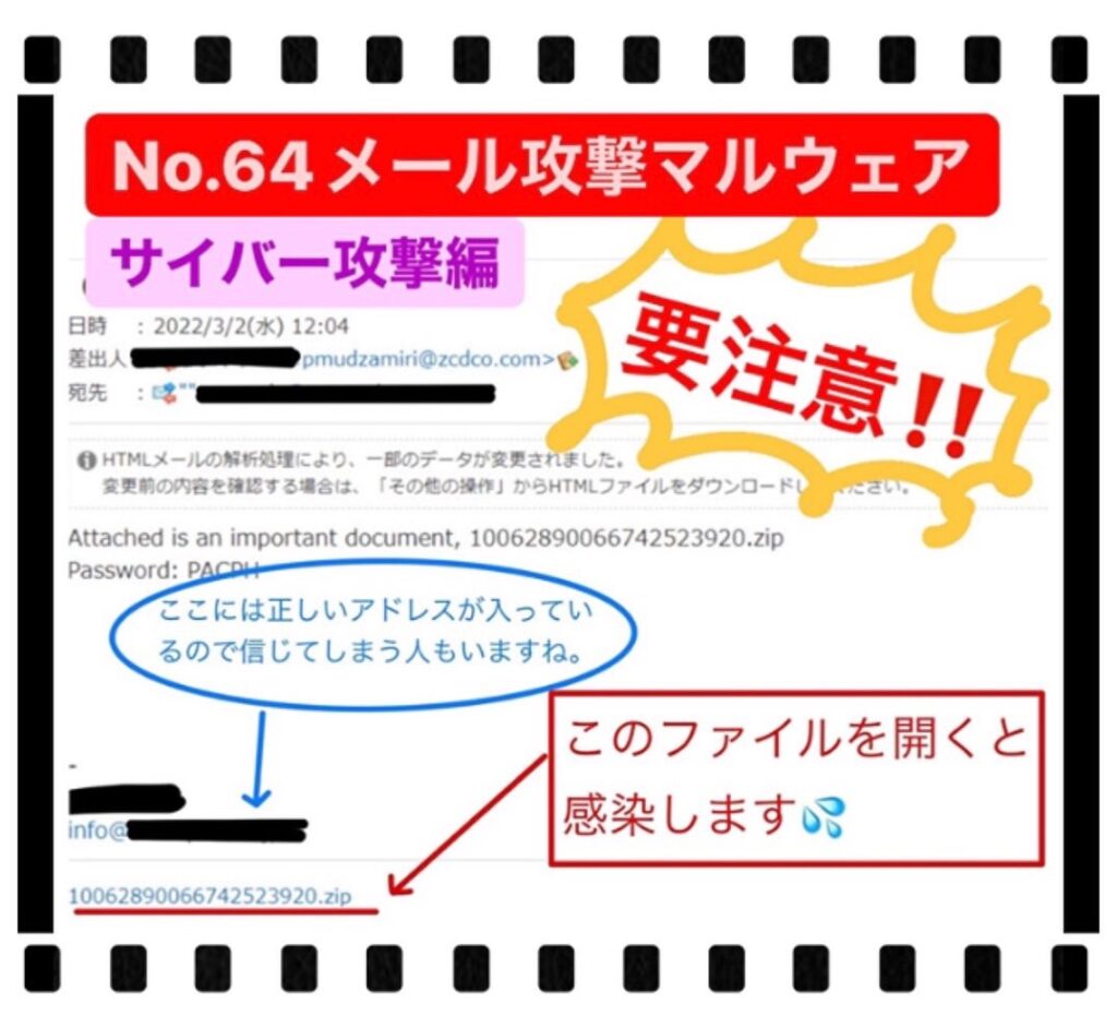 弊社ではサイバー攻撃に対しての講習を受けたりしていたのですぐにピンときて、添付ファイルは開けずにお客様に確認の連絡を入れました❗️