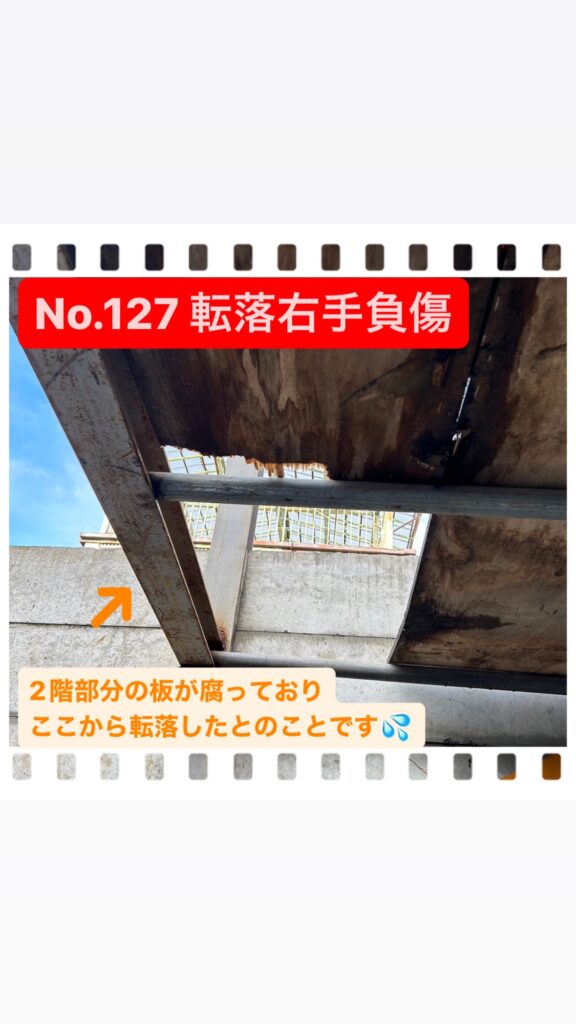 作業中の従業員さんが2階部分に登ったところ床板が腐っており、それを踏み抜いて転落してしまった事故です😓