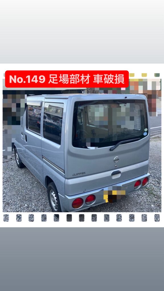 足場の下に駐車中の車両を凹ませてしまった事故です。