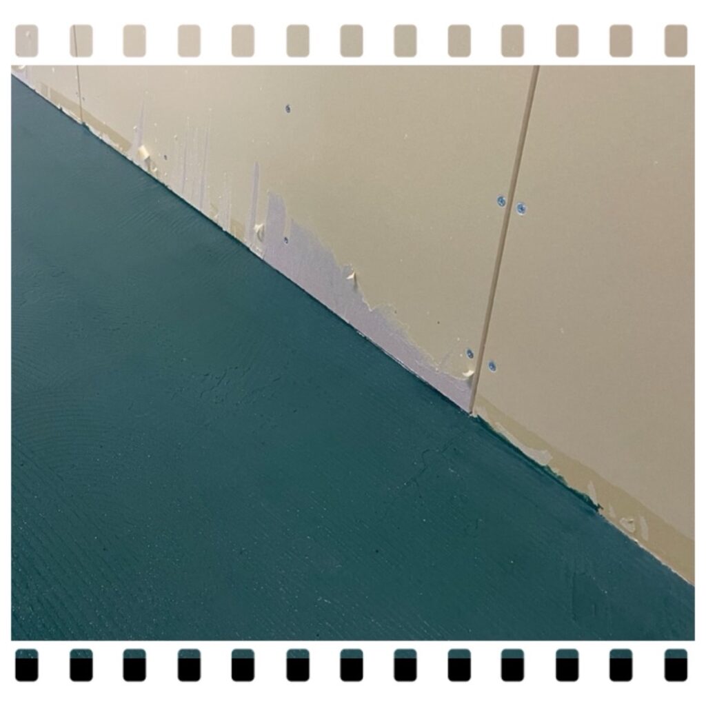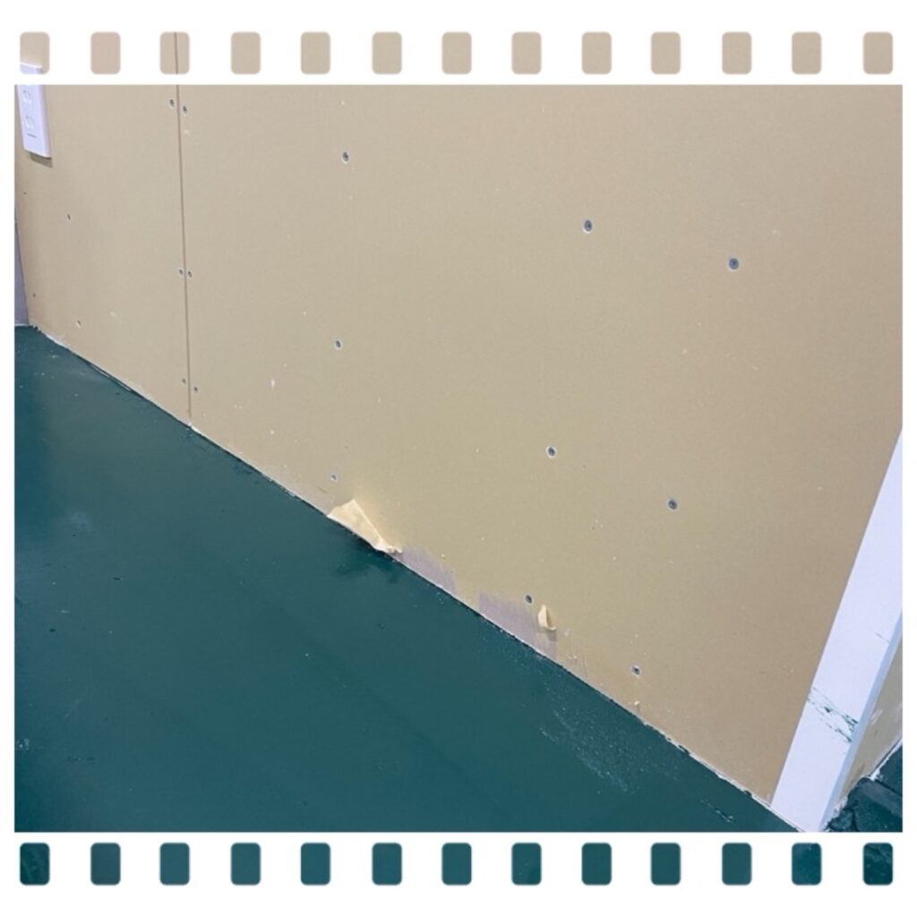 防水処理が終わって養生テープを剥がす際に、ボードの表面まで一緒に剥がれてしまった事故です💦