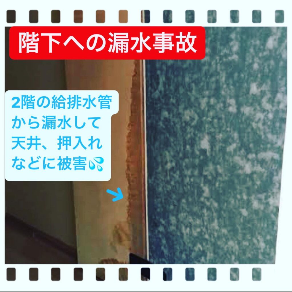 工事完了引き渡し後に配管が破裂し1階の天井、壁、押入れ、床を汚損させた漏水事故です。