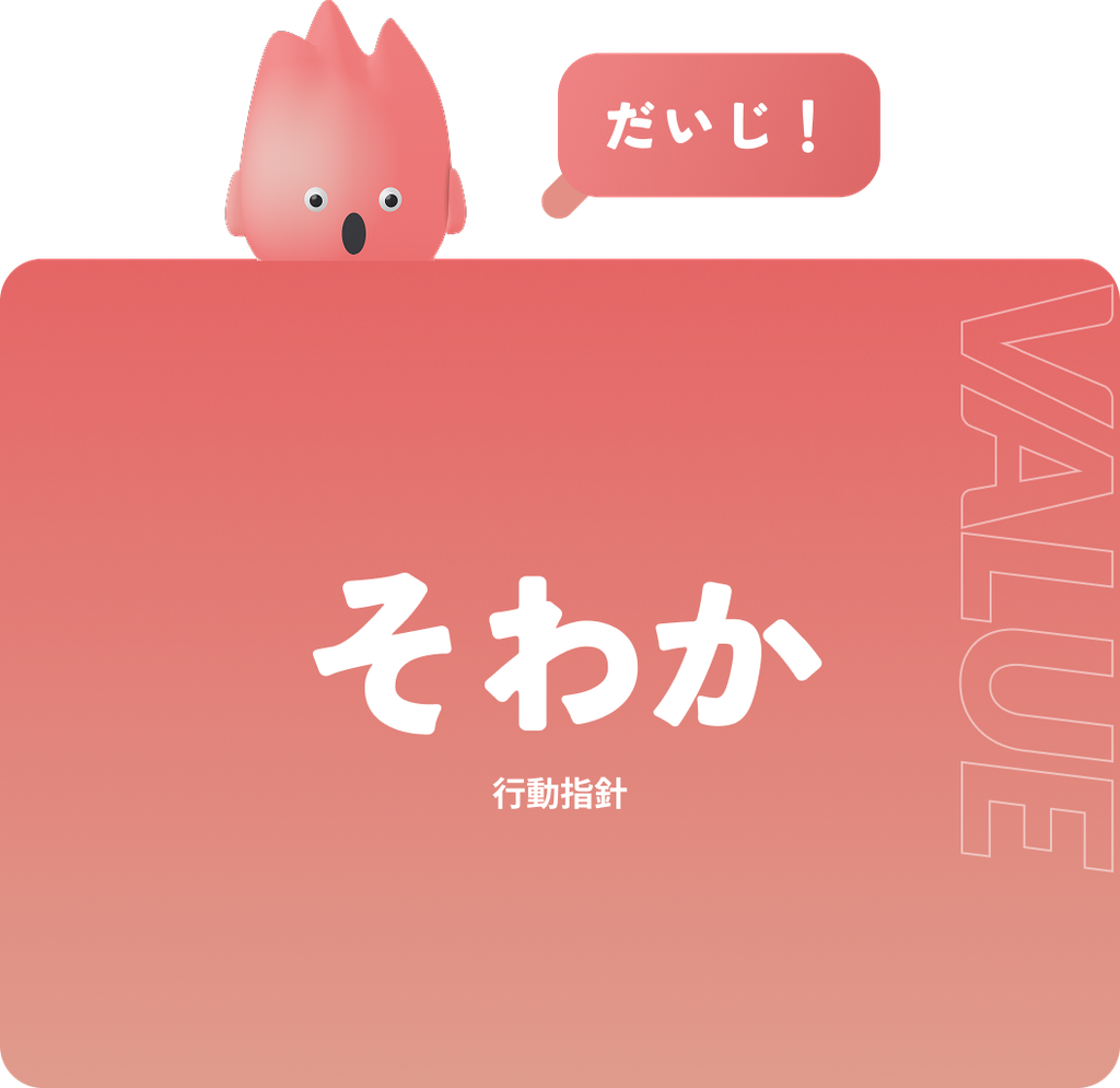 私たちは日々の行動の拠り所として「そわか」(掃除・笑い・感謝)を何よりも大切にしています。仕事の成功はもちろん、仲間一人ひとりの人生が幸せで充実してほしいと心から願っているからです。